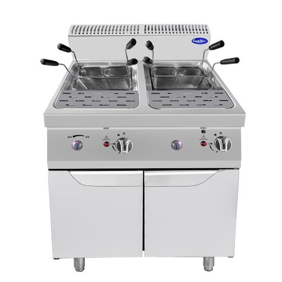 Kompaktowy warnik do makaronu z serii P700, wyposażony w dwie wanny tłoczone ze stali nierdzewnej AISI 316 o pojemności użytkowej 24 litrów każda. Dzięki zastosowaniu gazowego palnika o mocy 10 kW oraz piezoelektrycznego zapłonu, urządzenie zapewnia szybkie nagrzewanie i pełną kontrolę nad procesem gotowania.